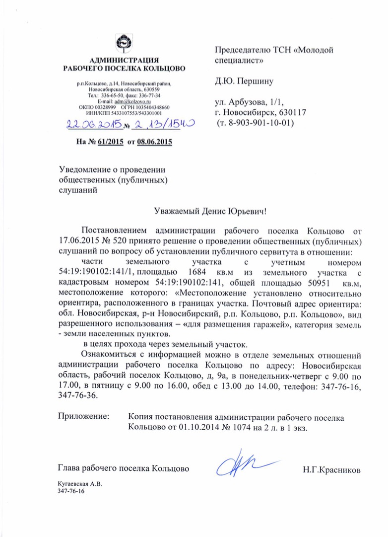 Слушания пройдут 30.07.2015 в 11:00 в зале заседаний администрации р.п. Кольцово (р.п. Кольцово, д.14, цокольный этаж).